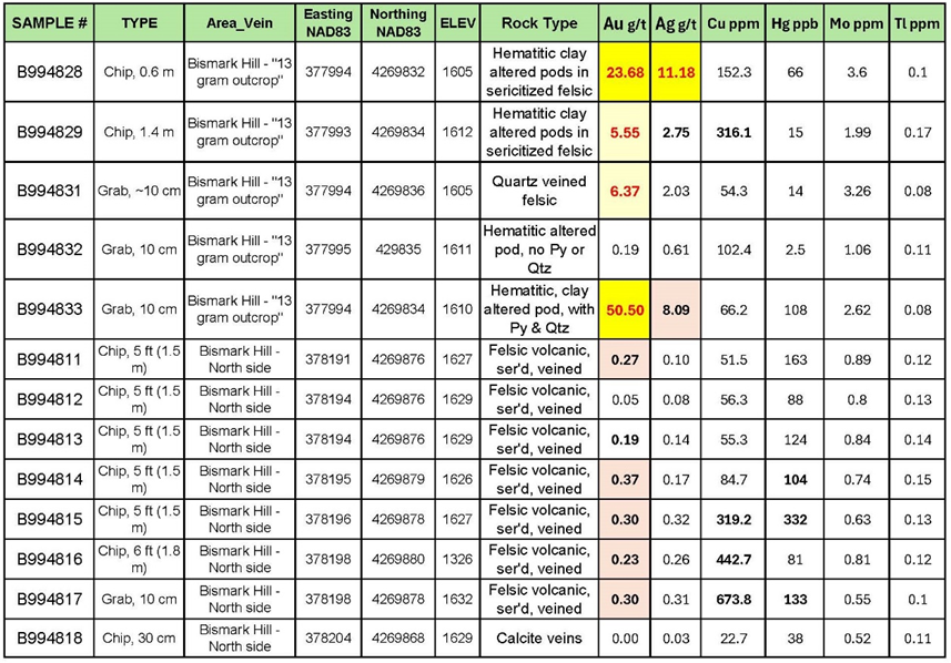 A Short-Wave Infrared (SWIR) alteration mineral study undertaken in 2023 identified a series of strong sericite (white mica) anomalies coincident with known mineralization on the property as well as multiple anomalies clustered in a 350 x 240 metre alteration zone centred on Bismark Hill (see Figure 2). Sericite is a key indicator mineral for hydrothermal alteration commonly associated with copper and gold bearing systems. The fall 2025 work, coupled with earlier sampling by the Company, has now confirmed the presence of gold ± copper mineralization at every sericite anomaly around Bismark Hill (Fig. 2). Noteworthy results include: